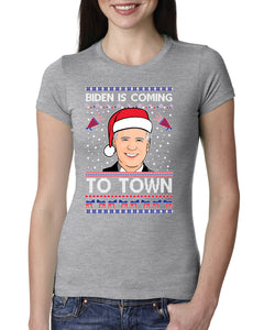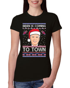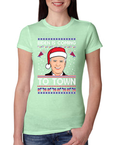 Biden Is Coming To Town Ugly Christmas Sweater Womens Slim Fit Junior Tee