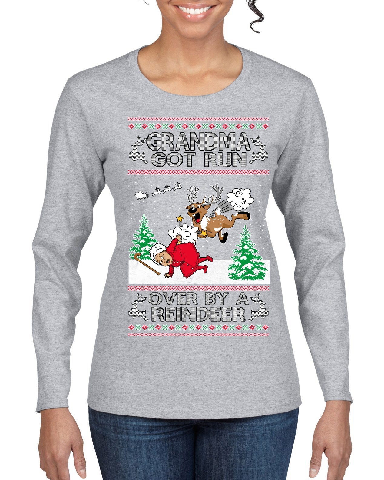 Grandma Got Run Over by a Reindeer, Funny Animated Design Rein Deer Kids TV Song Movie Ugly Christmas Sweater Womens Graphic Long Sleeve T-Shirt