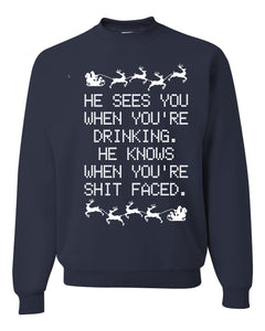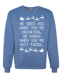 He Knows When You're Drinking Shit Faced Christmas Unisex Crewneck Graphic Sweatshirt