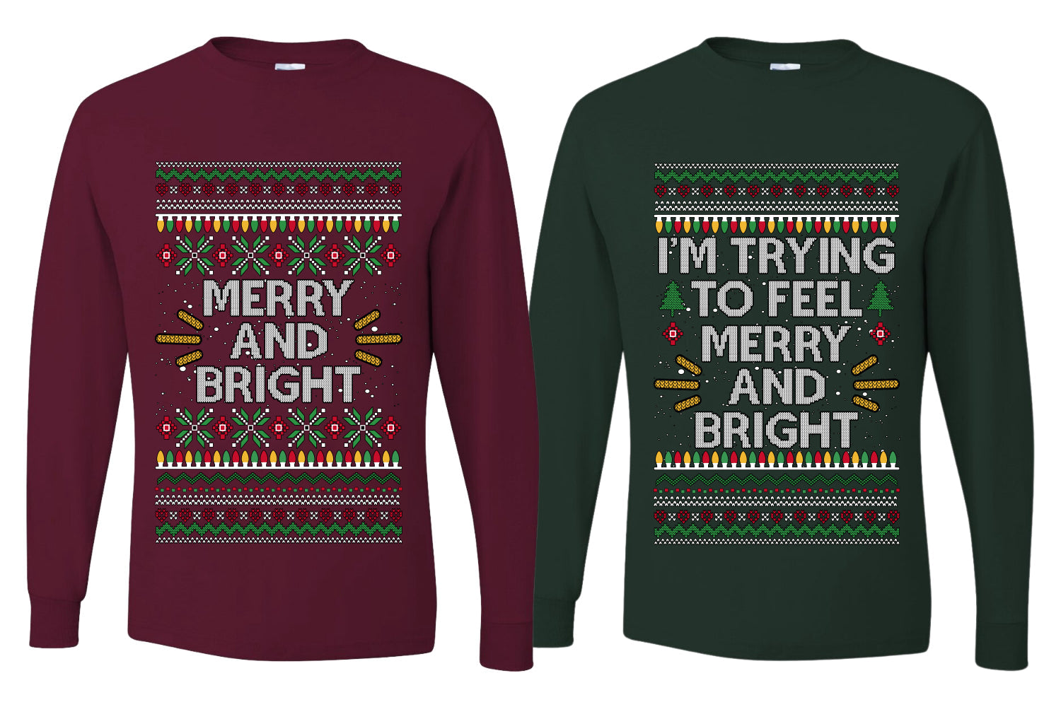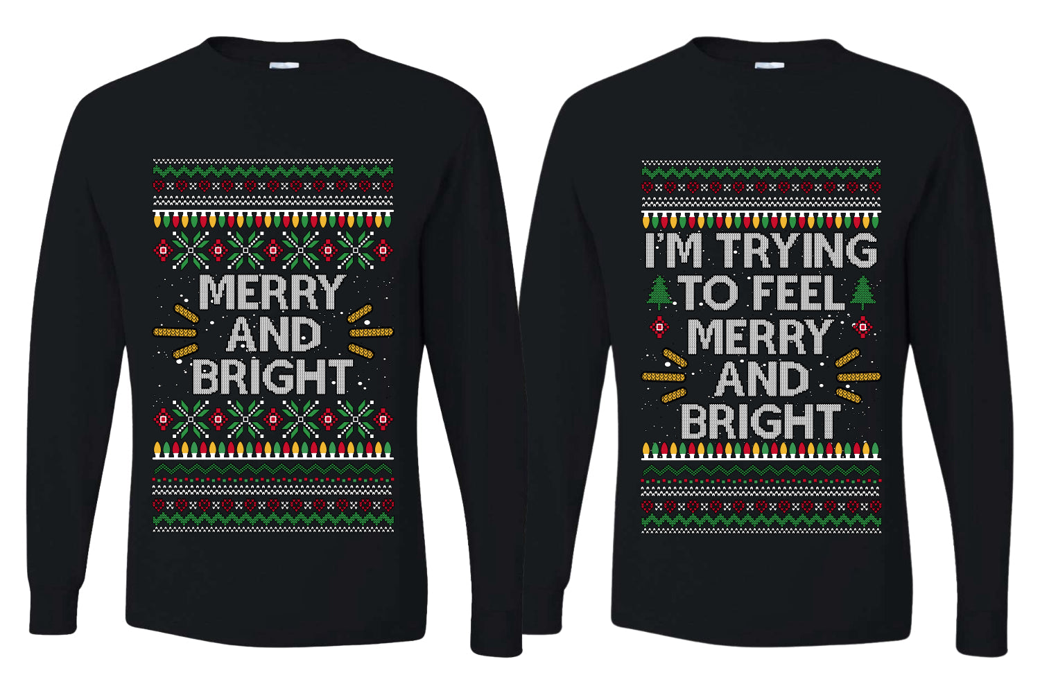 I'm Trying to Feel Merry and Bright Sweater Girlfriend Boyfriend Gift His and Hers Matching Ugly Christmas Couple Long Sleeve Shirt
