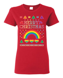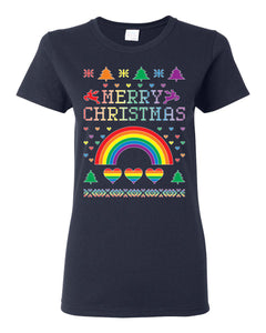 Merry Christmas Rainbow Hearts Womens Graphic T-Shirt