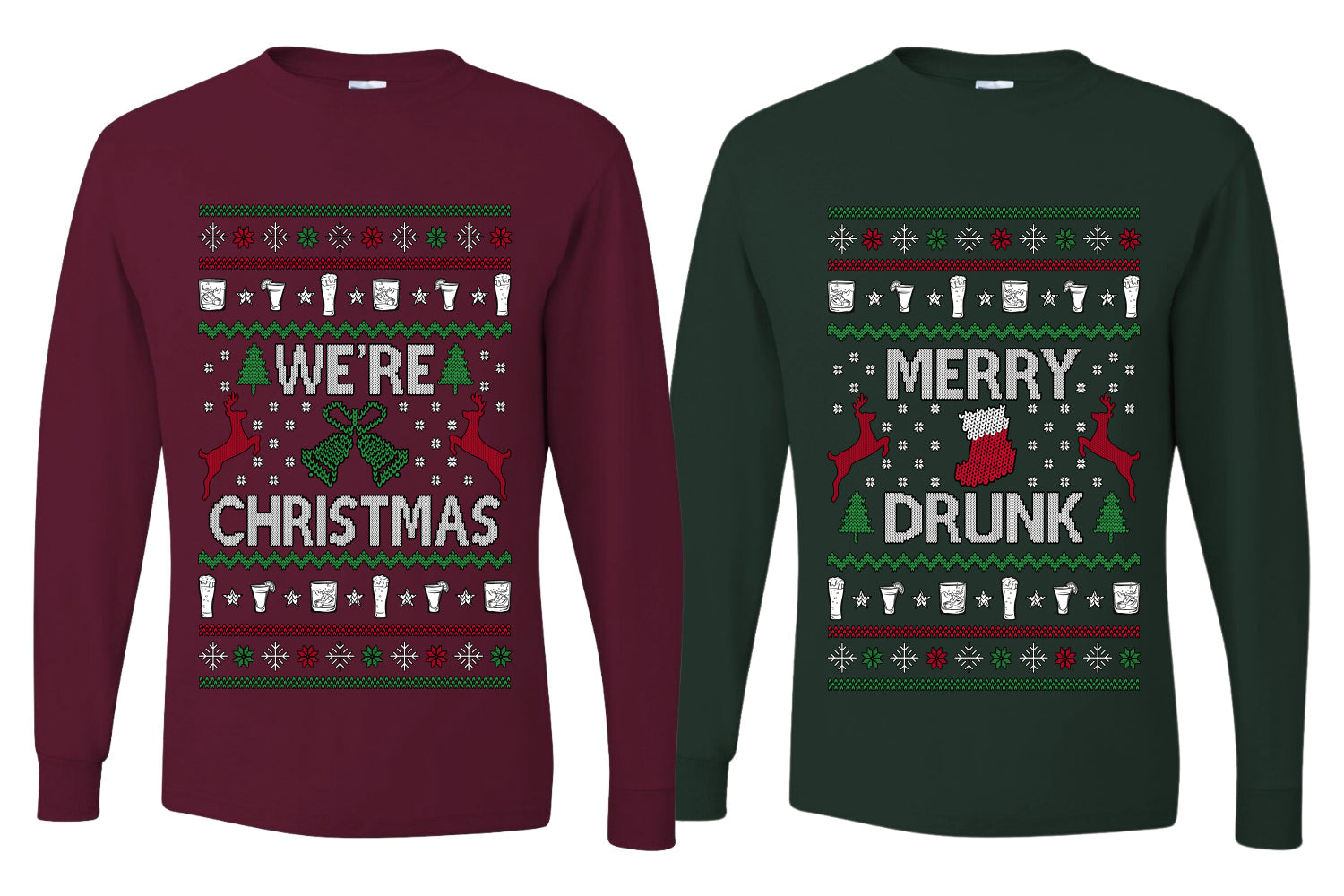Merry Drunk We're Christmas Sweater Girlfriend Boyfriend Gift His and Hers Matching Ugly Christmas Couple Long Sleeve Shirt