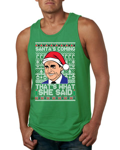 Santas Coming That's What She Said Michael Scott Ugly Christmas Sweater Mens Graphic Tank Top