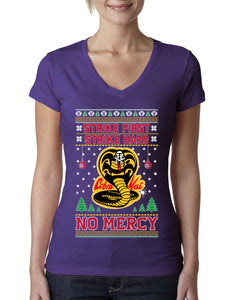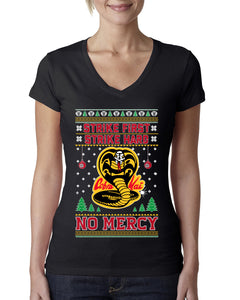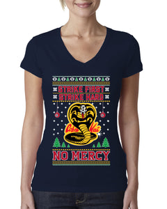 Strike First Strike Hard No Mercy Xmas Ugly Christmas Sweater Womens Junior Fit V-Neck Tee