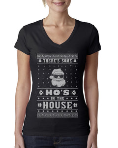 Theres Some Hos in the House Santa Ugly Christmas Sweater Womens Junior Fit V-Neck Tee