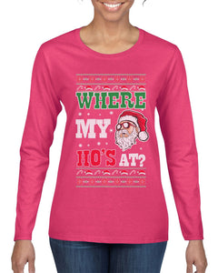 Where my Hos At Santa Funny Ugly Christmas Sweater Womens Graphic Long Sleeve T-Shirt