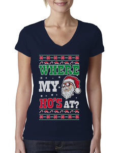 Where my Hos At Santa Funny Ugly Christmas Sweater Womens Junior Fit V-Neck Tee